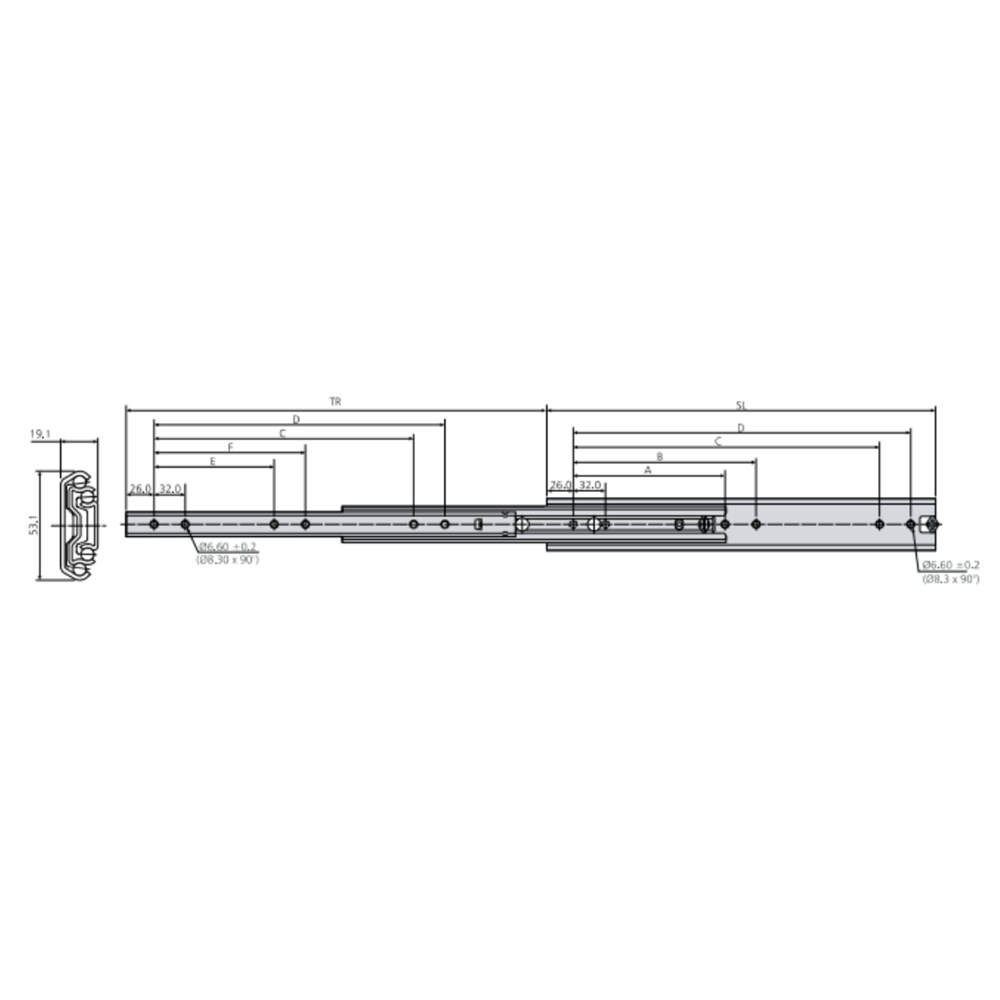 • Side space for installation between the cabinet and the drawer: rail thickness 19.1 mm +0.2 mm to +0.5 mm