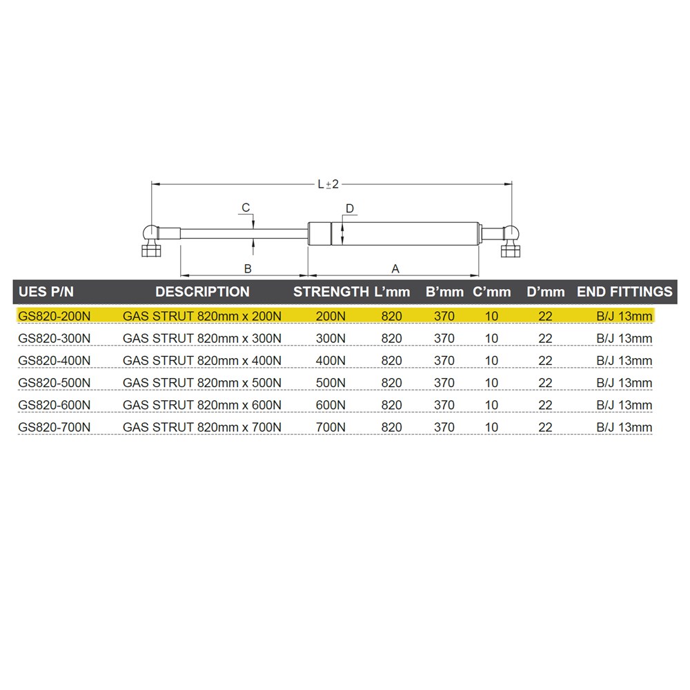 Gas Strut 820mm x 200N